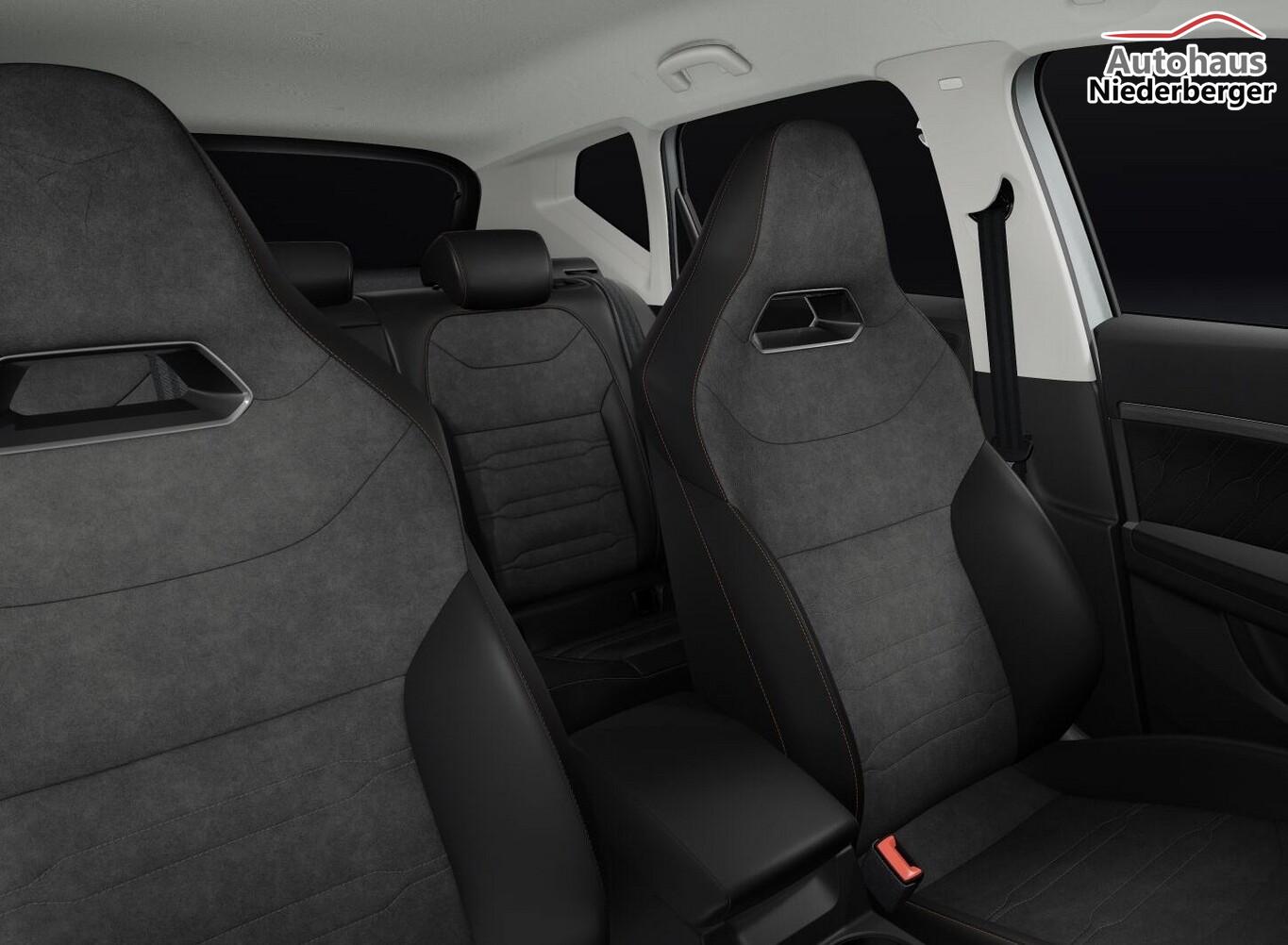 Fahrassistenz-System: Adaptive Fahrwerksregelung (DCC), Fahrassistenz-Paket (Fahrassistenz-Paket: Travel Assist / Fahrassistenz-Paket: Stau- und Notfallassistent / Fahrassistenz-System: Autom. Distanzregelung (ACC / PCC) mit vorausschauender Geschw.-Regelung / Fahrassistenz-System: Automatische Distanzregelung (ACC) / Fahrassistenz-System: Fernlichtassistent / Fahrassistenz-System: Totwinkel-Assistent mit Auspark-Assistent, Spurwechselassistent und Ausstiegswarnung / Fahrassistenz-System: Pre-Crash-System), Heckklappe/-Deckel elektr. betätigt (öffnen + schliessen, sensorgesteuert), Sitz vorn links elektr. verstellbar (mit Memory), Winter-Paket (Sitzheizung vorn), LM-Felgen 8x19 (Exclusive I, schwarz matt, glanzgedreht), Reserverad als Notrad, 8 Lautsprecher, Anschlussgarantie: 3 Jahre oder 100.000 km, Audio-Navigationssystem mit 9,2 Zoll Farb-Touchscreen, Dachspoiler, Fensterzierleisten Schwarz, Gepäckraumbeleuchtung LED, Gurtwarnanlage, Handschuhfach abschließbar, Induktionsladeschale für Smartphone (Connectivity Box), Innenelemente: Dekoreinlagen Aluminium gebürstet, Lenkrad unten abgeflacht, Radioempfang Digital (DAB), Reifen 235/40 R19, Scheibenwaschdüsen heizbar, Sitzbezug / Polsterung: Dinamica/Kunstleder, Sprachsteuerung, Stoßfänger Sport, USB-Schnittstelle vorn (2-fach, Typ C), Licht- und Sicht-Paket (Innenspiegel mit Abblendautomatik / Licht- und Regensensor / Lichtassistent (Coming Home, Leaving Home)), Bluetooth-Schnittstelle mit Freisprecheinrichtung integriert (Bluetooth Audio-Streaming), Scheinwerfer Voll-LED (Leuchtweitenregelung automatisch), Ablagetasche an Vordersitzlehnen, Ambiente-Beleuchtung LED, Brillenfach, Einstiegsleisten (Aluminium) vorn, beleuchtet, Fußraumbeleuchtung LED, Handschuhfach mit LED-Beleuchtung, Karosserie: 5-türig, Lendenwirbelstütze Sitz vorn links, verstellbar, Lendenwirbelstütze Sitz vorn rechts, verstellbar, Mittelarmlehne hinten, Mittelkonsole vorn mit Mittelarmlehne, Becherhalter, Ablagebox und Luftausströmer hinten, Motor 1,5 Ltr. - 110 kW 16V TSI ACT, Otto-Partikelfilter (OPF), Parkbremse elektrisch, Pedale Aluminium-Design, Radstand 2681 mm, Sitz vorn links höhenverstellbar, Sitz vorn rechts höhenverstellbar, Sonnenblende links mit Spiegel (beleuchtet), Sonnenblende rechts mit Spiegel (beleuchtet), Steckdose (12V-Anschluß) vorn, Full Link (MirrorLink, Apple CarPlay und Android Auto), USB-Ladeanschlüsse (2-fach, Typ C) für 2.Sitzreihe, Antriebsart: Frontantrieb, Elektron. Differentialsperre (XDS), Elektron. Stabilitätskontrolle (ESC), Wegfahrsperre (elektronisch), Getriebe 7-Gang - Doppelkupplungsgetriebe DSG, Klimaanlage Climatronic 2-Zonen, Airbag Beifahrerseite abschaltbar, Airbag Fahrer-/Beifahrerseite, Fensterheber elektrisch vorn + hinten mit Komfortschaltung, Isofix-Aufnahmen für Kindersitz an Rücksitz, Knieairbag Fahrerseite, Kopf-Airbag-System, Rücksitzlehne geteilt/klappbar (1/3-2/3), Schließ-/Startsystem Kessy, Seitenairbag, Seitenscheiben hinten und Heckscheibe abgedunkelt, Sport-Schalensitze vorn mit integrierten Kopfstützen, Zentralverriegelung mit Fernbedienung, Bordcomputer, Fahrassistenz-System: Fahrprofilauswahl (CUPRA Drive Profile), Dachreling schwarz, Fahrassistenz-System: Verkehrszeichenerkennung, Notrufsystem, Lenkrad heizbar (Sport/Leder) mit Multifunktion und Schaltfunktion, Servolenkung elektro-mechanisch, Außenspiegel elektr. verstell-, heiz- und anklappbar mit Spiegelabsenkung und Welcome Light, Heckleuchten LED mit dynamischem Blinklicht, Nebelscheinwerfer LED mit Abbiegelicht, Fahrassistenz-System: Parklenkassistent mit Einparkhilfe vorn und hinten inkl. Rückfahrkamera, Fahrassistenz-System: Müdigkeitserkennung, Fahrassistenz-System: Spurhalteassistent, Fahrassistenz-System: Umfeldbeobachtungssystem (Front assist) mit City-Notbremsfunktion, Reifenkontroll-Anzeige, Start/Stop-Anlage