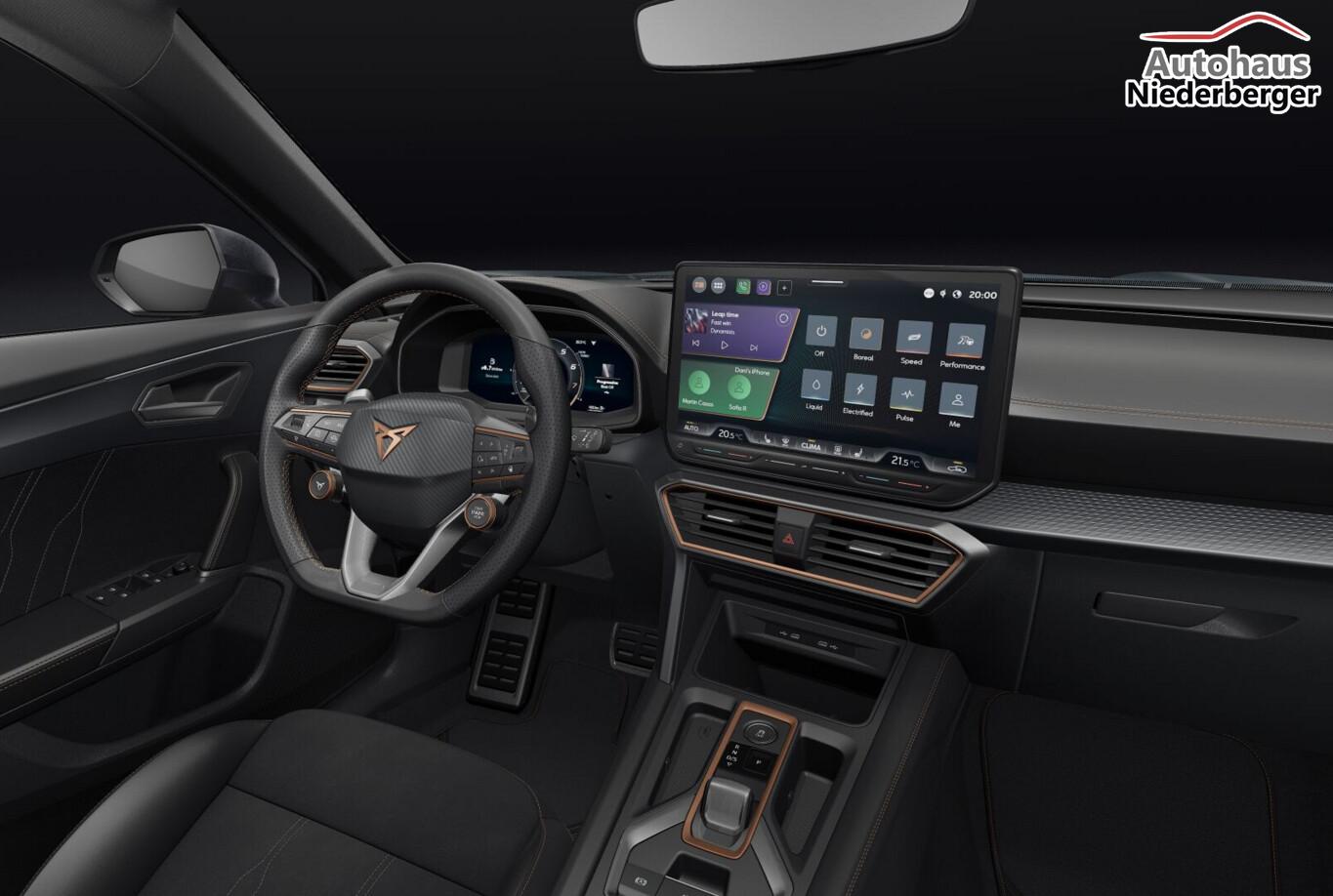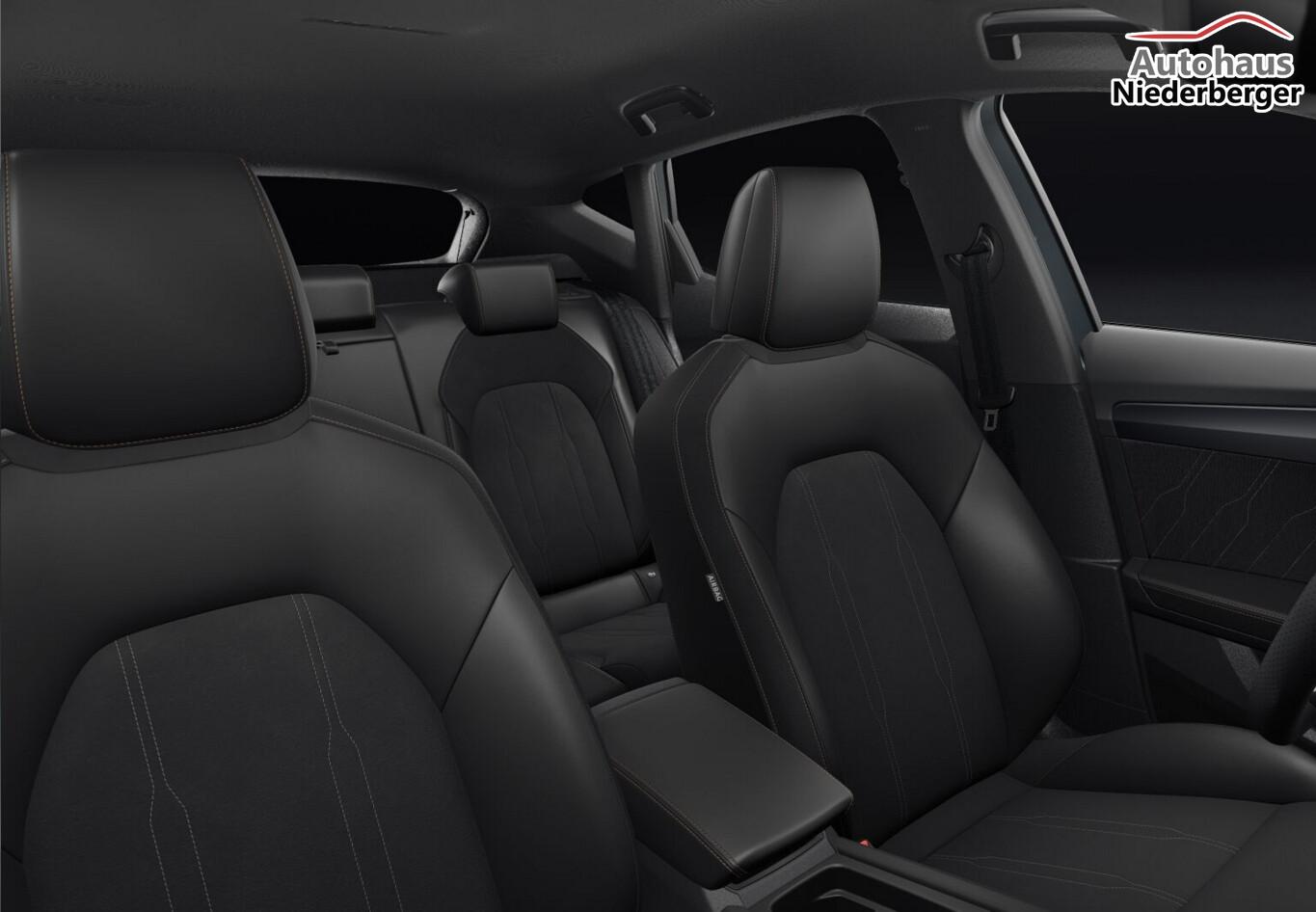 Winter-Paket (Sitzheizung vorn), Anhängerkupplung Vorbereitung, Ablagetaschen an Vordersitzlehnen, Ambiente-Beleuchtung einfarbig/monocolor, Audio-Infotainmentsystem mit Touchscreen Farbbildschirm 12,9", Fahrassistenz-System: Ausweich- und Abbiegeassistent, Induktionsladeschale für Smartphone, Knieairbag vorn, LM-Felgen 8x18, Navigation in Verbindung mit dem Smartphone (über Apple Carplay / Android Auto /...), Navigationssystem Vorbereitung, Pedale Aluminium-Design, Reifen 245/45 R18, Schadstoffarm nach Abgasnorm Euro 6e (EU6 EA), Sprachsteuerungs-System, Tagfahrlicht, Wegfahrsperre elektrisch, Licht- und Sicht-Paket (Innenspiegel mit Abblendautomatik / Einschaltautomatik für Fahrlicht / Licht- und Regensensor / Lichtassistent (Coming Home, Leaving Home)), Voll-LED-Paket (Leuchtweitenregelung automatisch / Heckleuchten Voll-LED mit dynamischem Lichtband (Infinite Light) / Nebelscheinwerfer LED mit Abbiegelicht / Scheinwerfer Voll-LED), Abdeckkappen Außenspiegel Schwarz, Dachhimmel schwarz, Einstiegsleisten vorn beleuchtet, Fensterzierleisten schwarz, Gepäck-/Laderaumboden doppelt, Karosserie: 5-türig, Kombiinstrument digital (virtual cockpit), Lendenwirbelstütze Sitz vorn links, verstellbar, Lendenwirbelstütze Sitz vorn rechts, verstellbar, Leseleuchten hinten LED, Leseleuchten vorn LED, Mild-Hybrid 110 kW (Motor 1,5 Ltr. - 110 kW eTSI), Otto-Partikelfilter (OPF), Parkbremse elektrisch mit Auto-Hold-Funktion, Radioempfang digital (DAB+), Sitz vorn links höhenverstellbar, Sitz vorn rechts höhenverstellbar, Sitzbezug / Polsterung: Stoff/Kunstleder schwarz (Sharp Textil), Sonnenblende links mit Spiegel (beleuchtet), Sonnenblende rechts mit Spiegel (beleuchtet), Steckdose 230V im Gepäckraum, Warnanlage für Sicherheitsgurt-System, Full Link (MirrorLink, Apple CarPlay und Android Auto), USB-Ladeanschlüsse (2-fach, Typ C) für 2.Sitzreihe, USB-Schnittstelle vorn (2-fach, Typ C), Antriebsart: Frontantrieb, Elektron. Differentialsperre (XDS), Getriebe 7-Gang - Doppelkupplungsgetriebe DSG, Klimaanlage Climatronic 3-Zonen, Airbag Beifahrerseite abschaltbar, Airbag Fahrer-/Beifahrerseite, Fensterheber elektrisch vorn + hinten mit Komfortschaltung, Isofix-Aufnahmen für Kindersitz an Beifahrersitz und Rücksitz (inkl. i-Size-Kindersitze), Kopf-Airbag-System, Mittelarmlehne vorn, Rücksitzlehne geteilt/klappbar mit Mittelarmlehne und Durchladeeinrichtung, Seitenairbag, Seitenairbag vorn mitte (Central Airbag), Seitenscheiben ab 2.Sitzreihe und Heckscheibe dunkel getönt (Privacy Glass), Zentralverriegelung / Startanlage Keyless Go (Start-Stop-Knopf), Fahrassistenz-System: Fahrprofilauswahl (CUPRA Drive Profile), Dachreling schwarz, hochglänzend, Wärmeschutzverglasung, Fahrassistenz-System: Autom. Distanzregelung (ACC / PCC) mit vorausschauender Geschw.-Regelung, Fahrassistenz-System: Verkehrszeichenerkennung, Notrufsystem, Lenkrad heizbar (CUPRA Supersport, Leder) mit Multifunktion und Schaltfunktion, Außenspiegel elektr. verstell-, heiz- und anklappbar mit Spiegelabsenkung und Welcome Light, Fahrassistenz-System: Fernlichtassistent, Einparkhilfe vorn und hinten, Fahrassistenz-System: Müdigkeitserkennung, Fahrassistenz-System: Spurhalteassistent, Fahrassistenz-System: Umfeldbeobachtungssystem (Front assist) mit City-Notbremsfunktion, Reifenkontroll-Anzeige, Start/Stop-Anlage
