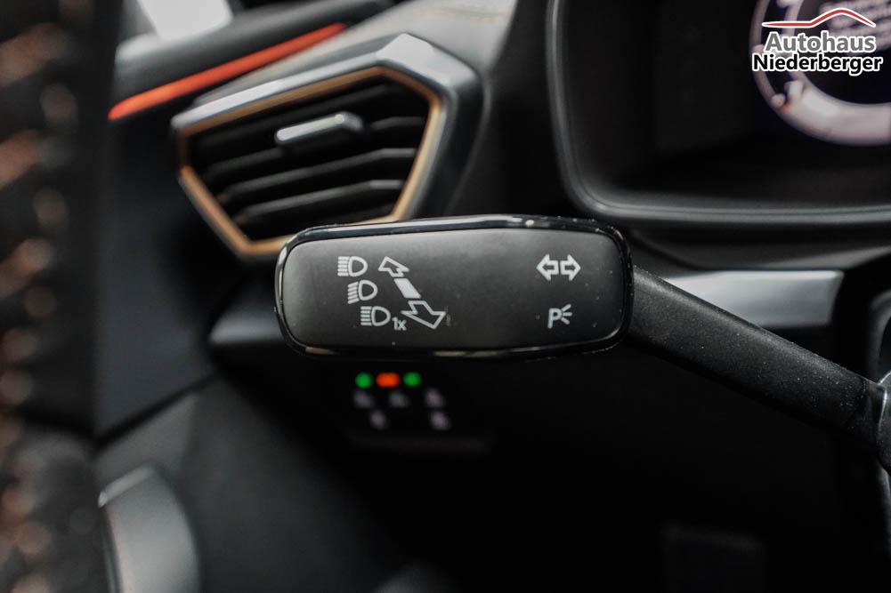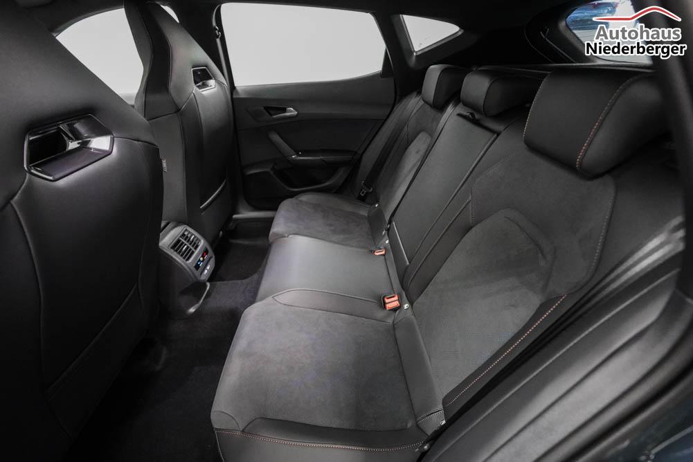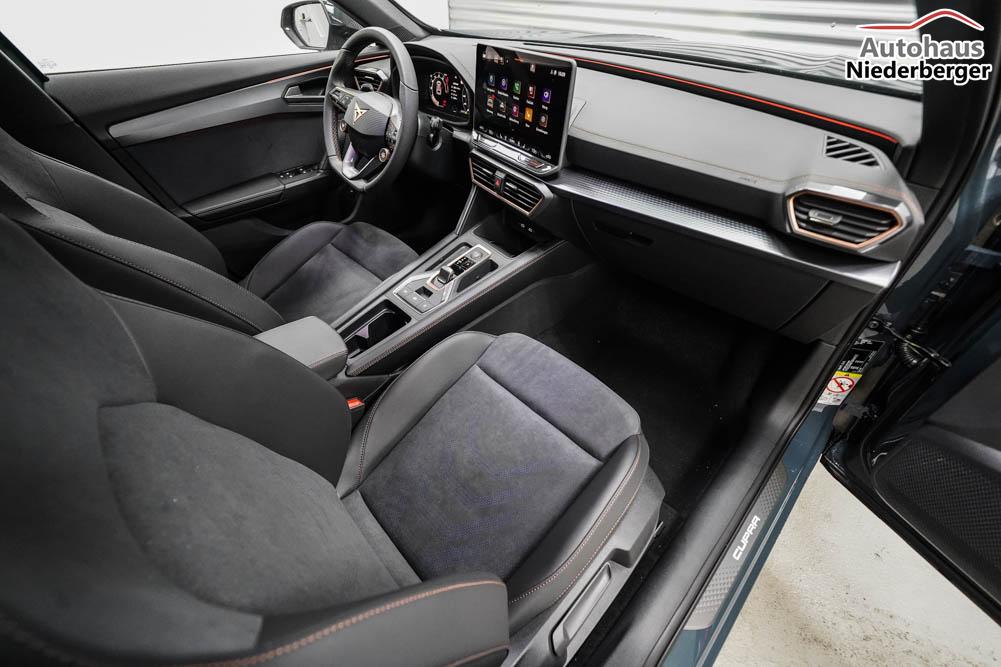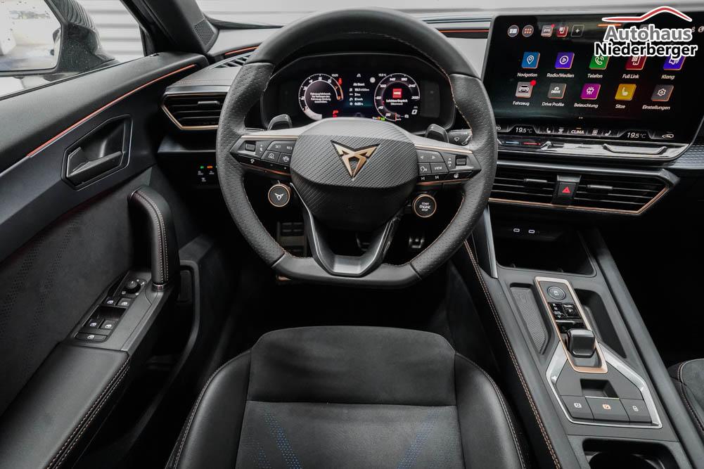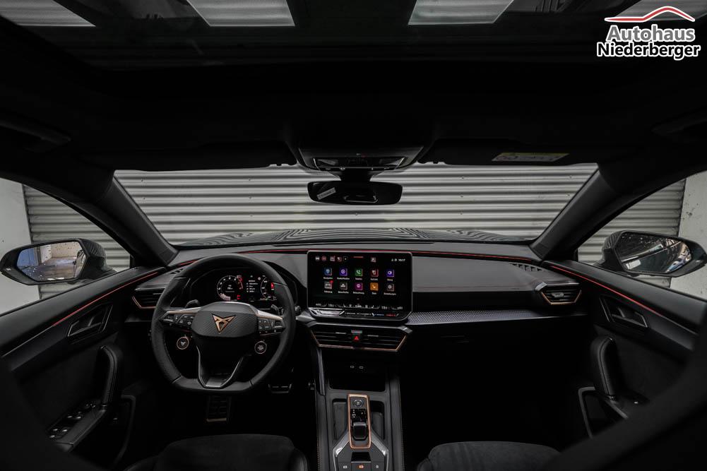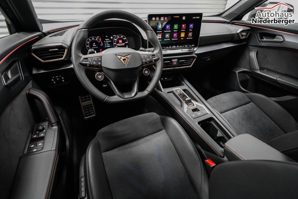 Beifahrersitz höhenverstellbar, Fahrersitz höhenverstellbar, Lederlenkrad, Lendenwirbelstütze, Mittelarmlehne vorne, Sitzbezug Stoff, Sportsitze, Gepäckraumabdeckung, geteilt umklappbare Rücksitzlehne, Lenkrad höhenverstellbar, Sitzbezug Dinamica, Ambiente-Beleuchtung, Elektrisch verstellbarer Fahrersitz mit Memory, Beheizbares Lenkrad, Multifunktionslenkrad mit Satellitentasten, Isofix, Isofix Beifahrersitz, abgedunkelte Scheiben, 19 Zoll Alufelgen Sandstorm, Dachreling schwarz, ABS, Alarmanlage, Außenspiegel elektrisch anklappbar, Fensterheber elektrisch, Kopfairbags, Nebelscheinwerfer, Schiebedach, Seitenairbags, Servolenkung, Sitzheizung vorne, DCC, ESP, Wegfahrsperre, Außenspiegel beheizbar, Beifahrerairbag, Fahrerairbag, Parkpilot hinten, Parkpilot vorne, Reifendruckkontrolle, Regensensor, Lichtsensor, Digital Cockpit, Anhängekupplung schwenkbar, Tempomat Abstand ACC, Fernlichtassistent, Spurhalteassistent plus, Totwinkelassistent, Verkehrszeichenerkennung, LED Matrix Scheinwerfer, LED-Tagfahrlicht, Pannenset, Rückfahrkamera, Intelligent Park-Assistent, Panoramadach, Elektrische Heckklappe inkl. Virtual Pedal, KeylessEntry, StartStopSystem, Innenspiegel automatisch abbl., Müdigkeitswarnsystem, Notrufsystem, Schaltwippen, Klimaautomatik 3-Zonen, 360-Grad-Kamera, Geschwindigkeitsbegrenzer, Freisprecheinrichtung, Induktionsladestation, Sprachsteuerung, USB, Radio DAB, Bluetooth, Bordcomputer, Radio-Navigationssystem, Schalensitze vorne, Cupra Full Link, variabler Ladeboden, erweiterte Herstellergarantie 5 Jahre/100.000km, Exit Assist, Stauassistent, Pre-Crash,