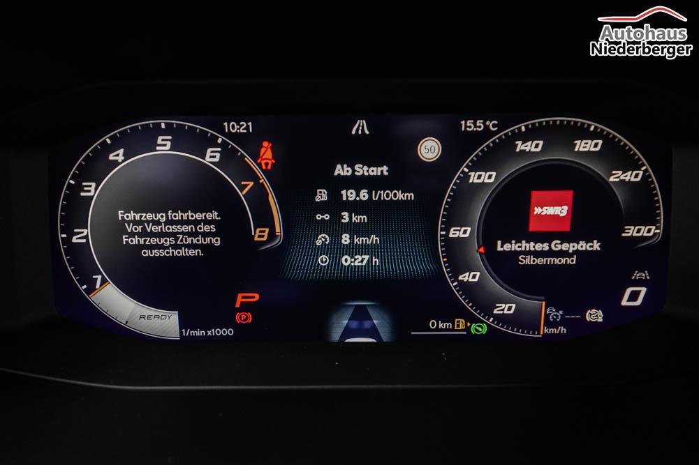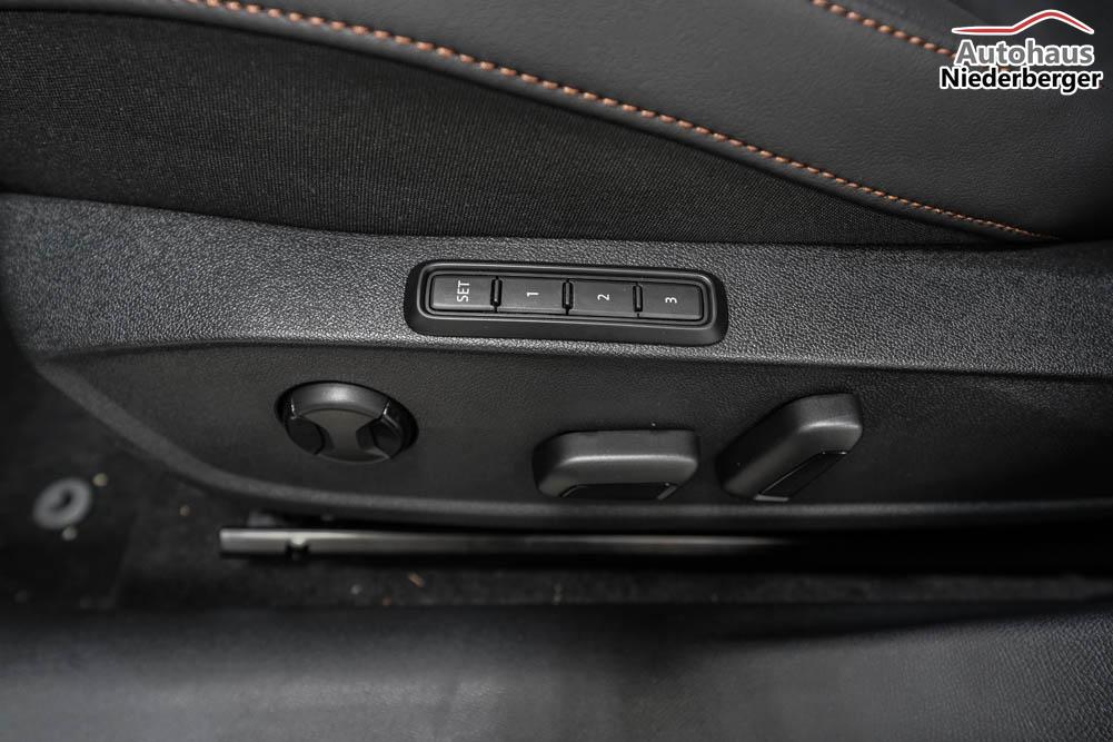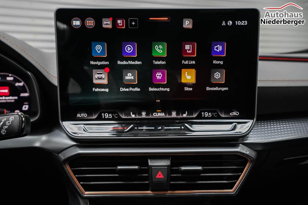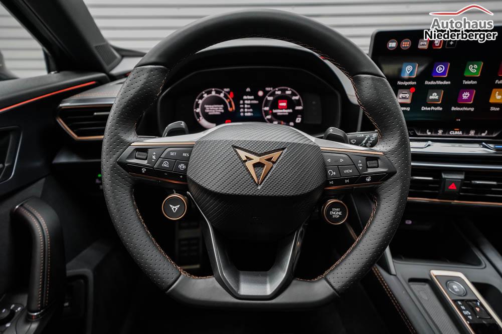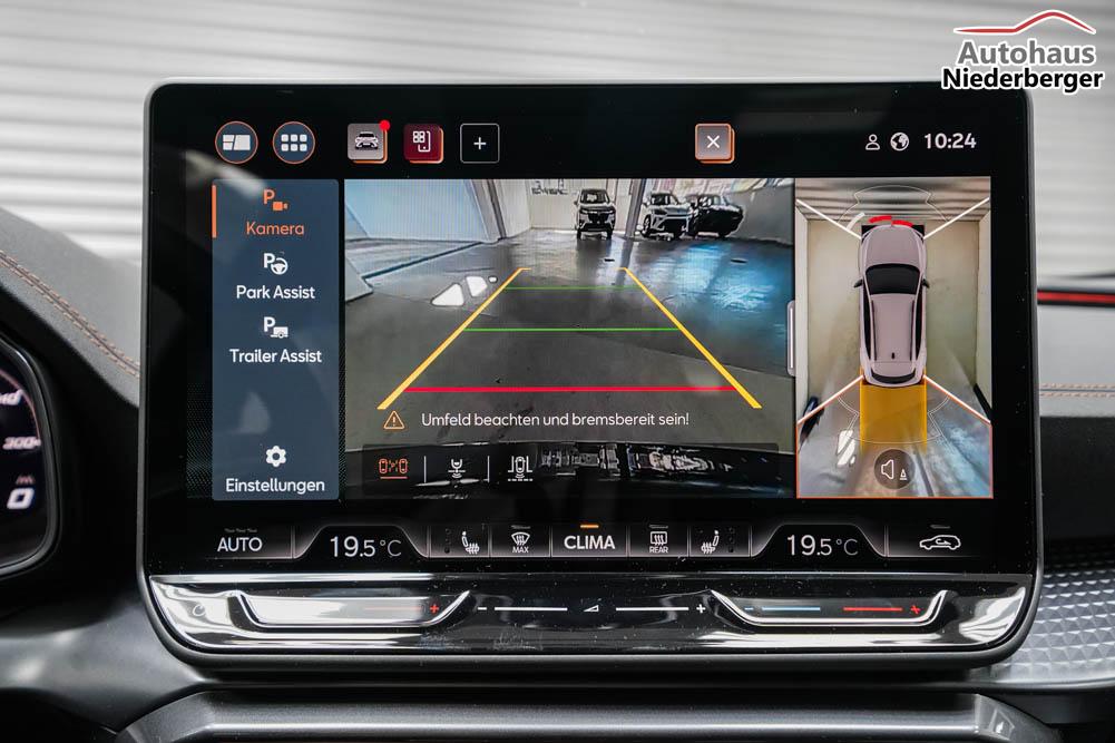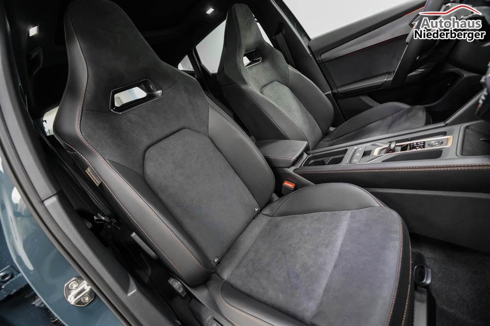 Beifahrersitz höhenverstellbar, Fahrersitz höhenverstellbar, Lederlenkrad, Lendenwirbelstütze, Mittelarmlehne vorne, Sitzbezug Stoff, Sportsitze, Gepäckraumabdeckung, geteilt umklappbare Rücksitzlehne, Lenkrad höhenverstellbar, Sitzbezug Dinamica, Ambiente-Beleuchtung, Elektrisch verstellbarer Fahrersitz mit Memory, Beheizbares Lenkrad, Multifunktionslenkrad mit Satellitentasten, Isofix, Isofix Beifahrersitz, abgedunkelte Scheiben, 19 Zoll Alufelgen Sandstorm, Dachreling schwarz, ABS, Alarmanlage, Außenspiegel elektrisch anklappbar, Fensterheber elektrisch, Kopfairbags, Nebelscheinwerfer, Schiebedach, Seitenairbags, Servolenkung, Sitzheizung vorne, DCC, ESP, Wegfahrsperre, Außenspiegel beheizbar, Beifahrerairbag, Fahrerairbag, Parkpilot hinten, Parkpilot vorne, Reifendruckkontrolle, Regensensor, Lichtsensor, Digital Cockpit, Anhängekupplung schwenkbar, Tempomat Abstand ACC, Fernlichtassistent, Spurhalteassistent plus, Totwinkelassistent, Verkehrszeichenerkennung, LED Matrix Scheinwerfer, LED-Tagfahrlicht, Pannenset, Rückfahrkamera, Intelligent Park-Assistent, Panoramadach, Elektrische Heckklappe inkl. Virtual Pedal, KeylessEntry, StartStopSystem, Innenspiegel automatisch abbl., Müdigkeitswarnsystem, Notrufsystem, Schaltwippen, Klimaautomatik 3-Zonen, 360-Grad-Kamera, Geschwindigkeitsbegrenzer, Freisprecheinrichtung, Induktionsladestation, Sprachsteuerung, USB, Radio DAB, Bluetooth, Bordcomputer, Radio-Navigationssystem, Schalensitze vorne, Cupra Full Link, variabler Ladeboden, erweiterte Herstellergarantie 5 Jahre/100.000km, Exit Assist, Stauassistent, Pre-Crash,