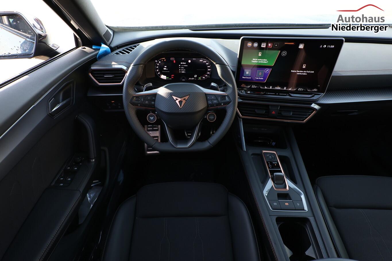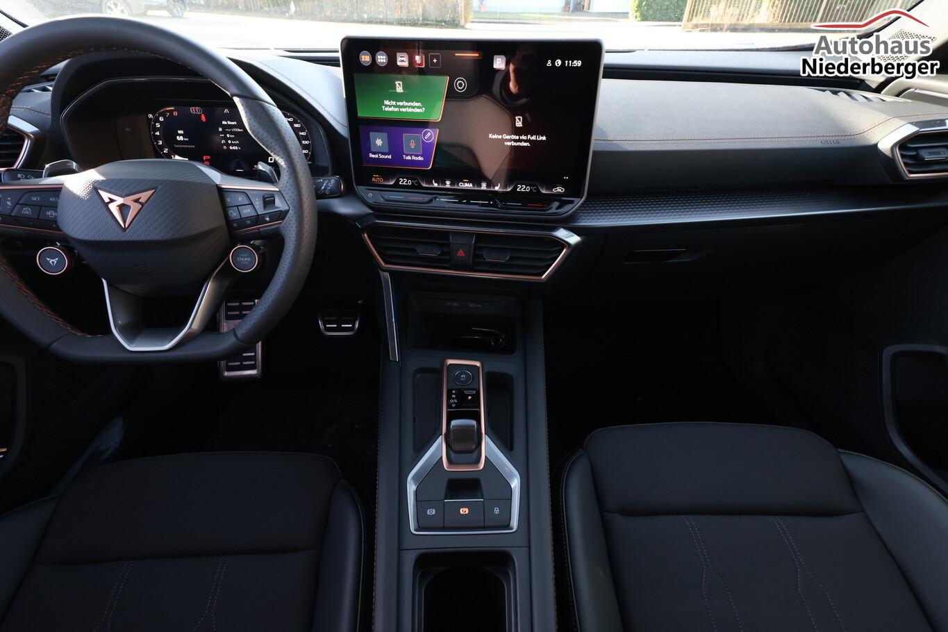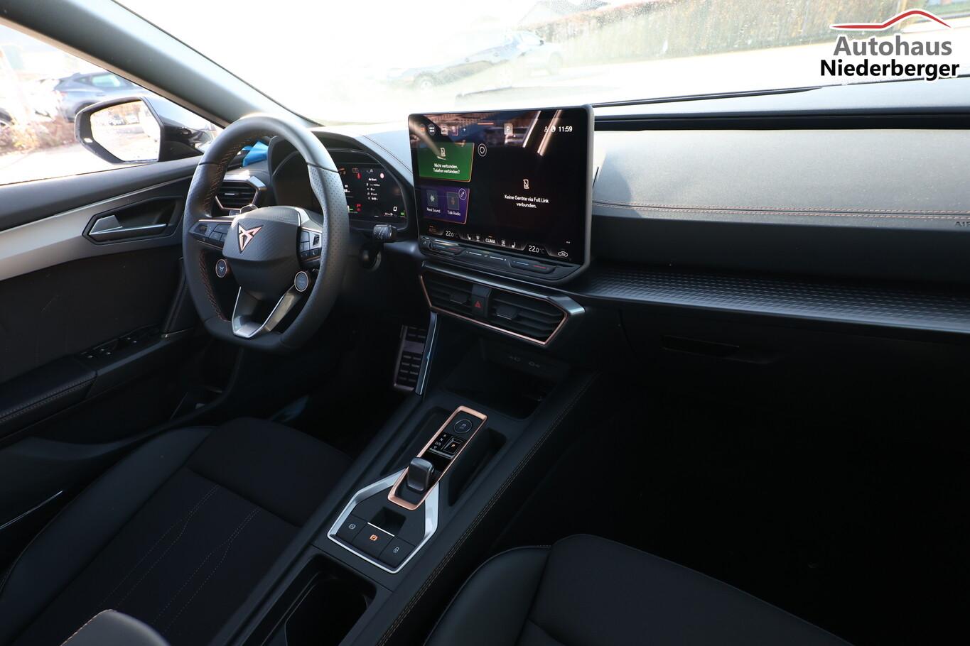 Winter-Paket (Sitzheizung vorn), Dachhimmel schwarz, Full Link (MirrorLink, Apple CarPlay und Android Auto), Induktionsladeschale für Smartphone, Audiosystem mit 12,9 Zoll Farb-Touchscreen, Außenspiegelgehäuse in Dark Aluminium, Einparkhilfe vorn und hinten, Fahrassistenz-System: Verkehrszeichenerkennung, Frontscheibe in Wärmeschutzverglasung, Keyless Start, Lenkrad mit Fahrmodusauswahl, Leseleuchten vorn und hinten, LM-Felgen 18 Zoll (Tempest), Navigation in Verbindung mit dem Smartphone (über Apple Carplay / Android Auto / ...), Pedale Aluminium, Reifen 245/45 R18, Schadstoffarm nach Abgasnorm Euro 6e (EU6EA), Licht- und Sicht-Paket (Innenspiegel mit Abblendautomatik / Licht- und Regensensor / Lichtassistent (Coming Home, Leaving Home)), Heckleuchten Voll-LED mit dynamischem Lichtband (Infinite Light) (Heckleuchten LED mit dynamischem Blinklicht), Scheinwerfer Voll-LED (Leuchtweitenregelung automatisch / Tagfahrlicht LED), Einstiegsleisten (Aluminium) vorn, beleuchtet, Fensterzierleisten schwarz hochglänzend, Karosserie: 5-türig, Kombiinstrument digital (virtual cockpit), Laderaumboden variabel und herausnehmbar, Lendenwirbelstütze Sitz vorn links, verstellbar, Lendenwirbelstütze Sitz vorn rechts, verstellbar, Mittelarmlehne hinten, Motor 1,5 Ltr. - 110 kW 16V TSI ACT, Otto-Partikelfilter (OPF), Radstand 2679 mm, Sitz vorn links höhenverstellbar, Sitz vorn rechts höhenverstellbar, Sitzbezug / Polsterung: Stoff, Sonnenblende links mit Spiegel (beleuchtet), Sonnenblende rechts mit Spiegel (beleuchtet), Bluetooth-Schnittstelle mit Freisprecheinrichtung integriert, USB-Ladeanschlüsse (2-fach, Typ C) für 2.Sitzreihe, USB-Schnittstelle vorn (2-fach, Typ C), Anti-Blockier-System (ABS), Antriebsart: Frontantrieb, Elektron. Stabilitätskontrolle (ESC), Getriebe 7-Gang - Doppelkupplungsgetriebe DSG, Klimaanlage Climatronic 3-Zonen, Airbag Beifahrerseite abschaltbar, Airbag Fahrer-/Beifahrerseite, Fensterheber elektrisch vorn + hinten mit Komfortschaltung, Seitenscheiben hinten und Heckscheibe abgedunkelt, Sportsitze vorn, Fahrassistenz-System: Fahrprofilauswahl (CUPRA Drive Profile), Dachreling schwarz, hochglänzend, Wärmeschutzverglasung, Fahrassistenz-System: Automatische Distanzregelung (ACC), Lenkrad heizbar (Sport/Leder) mit Multifunktion und Schaltfunktion, Servolenkung elektro-mechanisch, Außenspiegel elektr. verstell-, heiz- und anklappbar mit Spiegelabsenkung und Welcome Light, Blinkleuchten LED in Außenspiegel integriert, Fahrassistenz-System: Fernlichtassistent, Start/Stop-Anlage