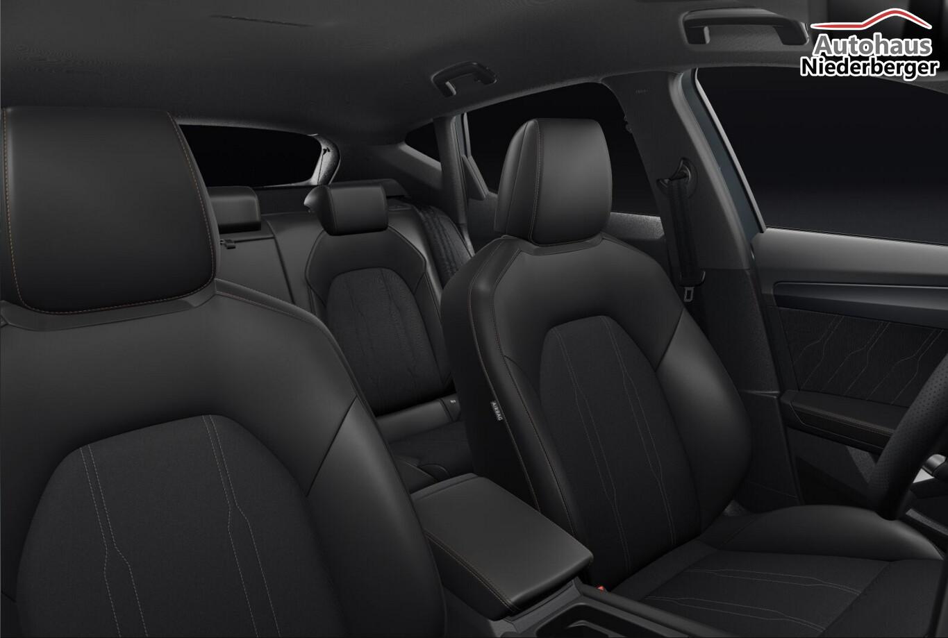 Edge-Paket (Ambiente-Beleuchtung LED / Ambiente-Beleuchtung Smart Ambient Light / Schließ-/Startsystem Kessy Advanced / Heckklappe/-Deckel elektr. betätigt (öffnen + schliessen, sensorgesteuert) / Rückfahrkamera / Diebstahl-Warnanlage mit Innenraumüberwachung und Abschleppschutz), Audiosystem: Immersive by Sennheiser Sound-System (390 Watt) (11 Lautsprecher / Subwoofer), Winter-Paket (Sitzheizung vorn), Anhängerkupplung Vorbereitung, Ablagetaschen an Vordersitzlehnen, Audio-Infotainmentsystem mit Touchscreen Farbbildschirm 12,9", Fahrassistenz-System: Ausweich- und Abbiegeassistent, Induktionsladeschale für Smartphone, Knieairbag vorn, LM-Felgen 8x18, Navigation in Verbindung mit dem Smartphone (über Apple Carplay / Android Auto /...), Navigationssystem Vorbereitung, Pedale Aluminium-Design, Reifen 245/45 R18, Schadstoffarm nach Abgasnorm Euro 6e (EU6 EA), Sprachsteuerungs-System, Tagfahrlicht, Wegfahrsperre elektrisch, Licht- und Sicht-Paket (Innenspiegel mit Abblendautomatik / Einschaltautomatik für Fahrlicht / Licht- und Regensensor / Lichtassistent (Coming Home, Leaving Home)), Voll-LED-Paket (Leuchtweitenregelung automatisch / Heckleuchten Voll-LED mit dynamischem Lichtband (Infinite Light) / Nebelscheinwerfer LED mit Abbiegelicht / Scheinwerfer Voll-LED), Abdeckkappen Außenspiegel Schwarz, Dachhimmel schwarz, Einstiegsleisten vorn beleuchtet, Fensterzierleisten schwarz, Gepäck-/Laderaumboden doppelt, Karosserie: 5-türig, Kombiinstrument digital (virtual cockpit), Lendenwirbelstütze Sitz vorn links, verstellbar, Lendenwirbelstütze Sitz vorn rechts, verstellbar, Leseleuchten hinten LED, Leseleuchten vorn LED, Mild-Hybrid 110 kW (Motor 1,5 Ltr. - 110 kW eTSI), Otto-Partikelfilter (OPF), Parkbremse elektrisch mit Auto-Hold-Funktion, Radioempfang digital (DAB+), Sitz vorn links höhenverstellbar, Sitz vorn rechts höhenverstellbar, Sitzbezug / Polsterung: Stoff/Kunstleder schwarz (Sharp Textil), Sonnenblende links mit Spiegel (beleuchtet), Sonnenblende rechts mit Spiegel (beleuchtet), Steckdose 230V im Gepäckraum, Warnanlage für Sicherheitsgurt-System, Full Link (MirrorLink, Apple CarPlay und Android Auto), USB-Ladeanschlüsse (2-fach, Typ C) für 2.Sitzreihe, USB-Schnittstelle vorn (2-fach, Typ C), Antriebsart: Frontantrieb, Elektron. Differentialsperre (XDS), Getriebe 7-Gang - Doppelkupplungsgetriebe DSG, Klimaanlage Climatronic 3-Zonen, Airbag Beifahrerseite abschaltbar, Airbag Fahrer-/Beifahrerseite, Fensterheber elektrisch vorn + hinten mit Komfortschaltung, Isofix-Aufnahmen für Kindersitz an Beifahrersitz und Rücksitz (inkl. i-Size-Kindersitze), Kopf-Airbag-System, Mittelarmlehne vorn, Rücksitzlehne geteilt/klappbar mit Mittelarmlehne und Durchladeeinrichtung, Seitenairbag, Seitenairbag vorn mitte (Central Airbag), Seitenscheiben ab 2.Sitzreihe und Heckscheibe dunkel getönt (Privacy Glass), Fahrassistenz-System: Fahrprofilauswahl (CUPRA Drive Profile), Dachreling schwarz, hochglänzend, Wärmeschutzverglasung, Fahrassistenz-System: Autom. Distanzregelung (ACC / PCC) mit vorausschauender Geschw.-Regelung, Fahrassistenz-System: Verkehrszeichenerkennung, Notrufsystem, Lenkrad heizbar (CUPRA Supersport, Leder) mit Multifunktion und Schaltfunktion, Außenspiegel elektr. verstell-, heiz- und anklappbar mit Spiegelabsenkung und Welcome Light, Fahrassistenz-System: Fernlichtassistent, Einparkhilfe vorn und hinten, Fahrassistenz-System: Müdigkeitserkennung, Fahrassistenz-System: Spurhalteassistent, Fahrassistenz-System: Umfeldbeobachtungssystem (Front assist) mit City-Notbremsfunktion, Reifenkontroll-Anzeige, Start/Stop-Anlage