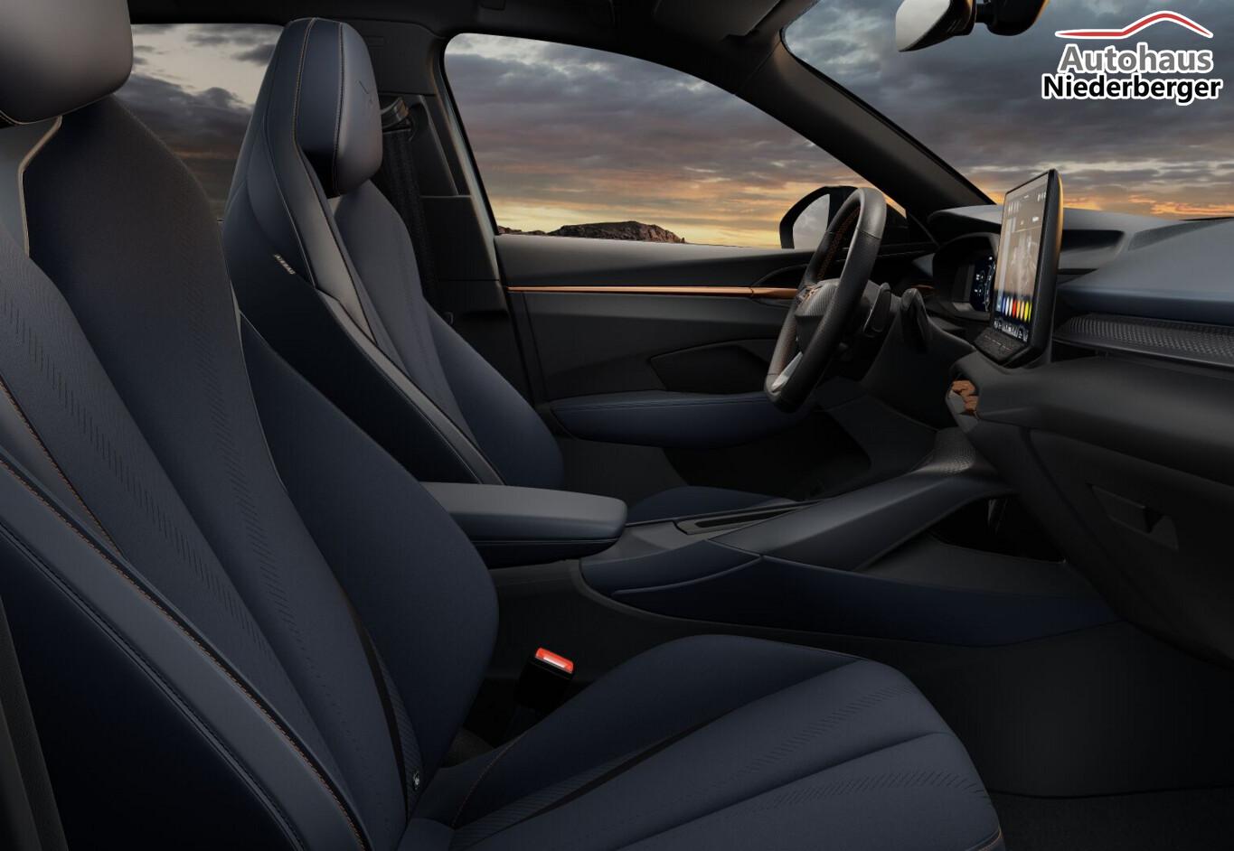 Heckklappe/-Deckel elektr. betätigt (öffnen + schliessen, sensorgesteuert), Diebstahl-Warnanlage mit Innenraumüberwachung und Abschleppschutz, Induktionsladeschale für Smartphone, 2 Leseleuchte vorn und hinten, Adaptive Geschwindigkeits-Regelanlage (ACC), Anschlussgarantie: 1 Jahr oder 90.000 km, Bremsenergie-Rückgewinnung, Diebstahlsicherung für Räder (Felgenschlösser), Digital Drive Paket, Edge-Paket, Fahrassistenz-System: Einparkhilfe vorn und hinten inkl. Rückfahrkamera, Fensterzierleisten Schwarz, Feststellbremse, Fußgängerschutz-System, Gepäckraumboden variabel, Head-Up-Display, Heckscheibenwischer, Isofix-Aufnahmen für Kindersitz am Beifahrersitz, Klimaanlage Climatronic 3-Zonen, Kopfstütze hinten (3-fach), Kopfstützen vorn, LM-Felgen 18 Zoll, Motor 1,5 Ltr. - 110 kW eTSI, Nebelschlusslicht, Reifen 235/55 R18, Schadstoffarm nach Abgasnorm Euro 6e (EU6EA), Schließ-/Startsystem Keyless Advanced mit Safelock, Service-/Wartungsintervall: 2 Jahre oder 30.000 km, Sicherheitsgurt-Kontrollsystem, Sitzbezug/Polsterung : Stoff, Sitzheizung vorn, Sportsitze vorn, Türgriffe in Wagenfarbe, Licht- und Sicht-Paket (Innenspiegel mit Abblendautomatik / Licht- und Regensensor / Lichtassistent (Coming Home, Leaving Home)), Audio-Navigationssystem mit Touchscreen Farbbildschirm (Mobile Online Dienste Cupra Connect / Radioempfang digital (DAB+) / Sprachsteuerungs-System / USB-Schnittstelle vorn (2-fach, Typ C)), Scheinwerfer Voll-LED (Leuchtweitenregelung automatisch), Ambiente-Beleuchtung LED, Einstiegsleisten (Aluminium) vorn, beleuchtet, Fußraumbeleuchtung LED, Karosserie: 5-türig, Kombiinstrument digital (virtual cockpit), Lendenwirbelstütze Sitz vorn links, verstellbar, Lendenwirbelstütze Sitz vorn rechts, verstellbar, Mittelarmlehne hinten, Mittelkonsole vorn mit Mittelarmlehne, Becherhalter, Ablagebox und Luftausströmer hinten, Otto-Partikelfilter (OPF), Radstand 2681 mm, Sitz vorn links höhenverstellbar, Sitz vorn rechts höhenverstellbar, Sonnenblende links mit Spiegel (beleuchtet), Sonnenblende rechts mit Spiegel (beleuchtet), Full Link (MirrorLink, Apple CarPlay und Android Auto), USB-Ladeanschlüsse (2-fach, Typ C) für 2.Sitzreihe, Antriebsart: Frontantrieb, Elektron. Stabilitätskontrolle (ESC), Wegfahrsperre (elektronisch), Getriebe 7-Gang - Doppelkupplungsgetriebe DSG, Airbag Beifahrerseite abschaltbar, Airbag Fahrer-/Beifahrerseite, Fensterheber elektrisch vorn + hinten mit Komfortschaltung, Isofix-Aufnahmen für Kindersitz an Rücksitz, Kopf-Airbag-System, Rücksitzlehne geteilt/klappbar (1/3-2/3), Schließ-/Startsystem Kessy, Seitenairbag, Seitenscheiben hinten und Heckscheibe abgedunkelt, Bordcomputer, Fahrassistenz-System: Fahrprofilauswahl (CUPRA Drive Profile), Dachreling schwarz, Wärmeschutzverglasung, Fahrassistenz-System: Verkehrszeichenerkennung, Notrufsystem, Lenkrad heizbar (Sport/Leder) mit Multifunktion und Schaltfunktion, Servolenkung elektro-mechanisch, Außenspiegel elektr. verstell-, heiz- und anklappbar mit Spiegelabsenkung und Welcome Light, Heckleuchten LED mit dynamischem Blinklicht, Nebelscheinwerfer LED mit Abbiegelicht, Tagfahrlicht LED, Fahrassistenz-System: Müdigkeitserkennung, Fahrassistenz-System: Spurhalteassistent, Fahrassistenz-System: Umfeldbeobachtungssystem (Front assist) mit City-Notbremsfunktion, Reifenkontroll-Anzeige, Start/Stop-Anlage