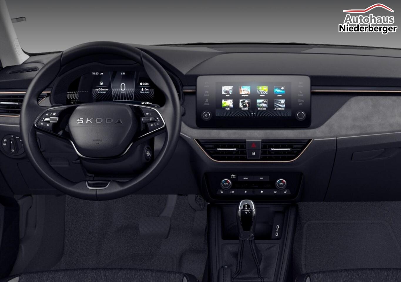 Interieur-Design-Paket Lodge (Ambiente-Beleuchtung LED in Rot / Ambiente-Beleuchtung LED in weiß / Innenausstattung: Dekoreinlagen Suedia Grau / Innenausstattung: Interieurleisten Schwarz / Copper / Innenausstattung: Luftausströmer Copper / Mittelarmlehne hinten / Sitzbezug / Polsterung: Stoff Lodge Schwarz / Grau / Copper), Lenkrad heizbar, Außenspiegel elektr. anklappbar, mit Abblendautomatik Fahrerseite, Gurtwarnanlage, Innenausstattung: Dekoreinlagen Suedia Grau, Innenspiegel mit Abblendautomatik, Klimaanlage 2-Zonen Climatronic, Licht- und Regensensor, LM-Felgen 16" (Cortadero), Mittelarmlehne hinten, Navigation in Verbindung mit dem Smartphone (über Apple Carplay / Android Auto /...), Reifen 205/60 R16, Schadstoffarm nach Abgasnorm Euro 6e (EU6 EA), Seitenscheiben hinten und Heckscheibe abgedunkelt (SunSet), Sitzheizung vorn, Phonebox (Induktionsladeschale für Smartphone), 3. Bremsleuchte LED, 8 Lautsprecher, Ablagetasche an Vordersitzlehnen, Außenspiegel Wagenfarbe, Bremsenergierückgewinnung, Brillenfach, Elektr. Bremskraftverteilung (EBV), Infotainment-System mit 8,2" Display, Innenraumfilter: Staub- und Pollenfilter, Karosserie: 5-türig, Kombiinstrument digital (virtual cockpit), Lendenwirbelstütze Sitz vorn links, Lendenwirbelstütze Sitz vorn rechts, Motor 1,0 Ltr. - 85 kW TSI, Netzprogramm im Kofferraum, Otto-Partikelfilter (OPF), Radioempfang digital (DAB+), Radstand 2651 mm, Schalt-/Wählhebelgriff Leder, Sitz vorn links höhenverstellbar, Steckdose (12V-Anschluß) im Koffer-/Laderaum, Türgriffe außen Wagenfarbe, Freisprechanlage Telefon mit Bluetooth, Innenspiegel mit USB-Anschluss (Typ C), USB-Ladeanschlüsse (2-fach, Typ C) für 2.Sitzreihe, USB-Schnittstelle vorn (2-fach, Typ C), Wireless SmartLink, Anti-Blockier-System (ABS), Bremsassistent, Antriebs-Schlupfregelung (ASR), Antriebsart: Frontantrieb, Elektron. Differentialsperre (EDS), Elektron. Querdifferentialsperre (XDS), Elektron. Stabilitäts-Programm (ESP), Getriebe 7-Gang - Doppelkupplungsgetriebe DSG, Airbag Beifahrerseite abschaltbar, Airbag Fahrer-/Beifahrerseite, Fensterheber elektrisch vorn + hinten, Fernbedienung für Zentralverriegelung, Isofix-Aufnahmen für Kindersitz an Beifahrersitz, Isofix-Aufnahmen für Kindersitz an Rücksitz, Kopf-Airbag-System, Rücksitzlehne geteilt/klappbar (1/3-2/3), Seitenairbag vorn, Zentralverriegelung, Fahrassistenz-System: Berganfahr-Assistent (Hill-Holder), Fahrassistenz-System: Verkehrszeichenerkennung, Geschwindigkeits-Regelanlage (Tempomat) inkl. Geschwindigkeits-Begrenzeranlage, Notrufsystem, Servolenkung, Außenspiegel elektr. verstell- und heizbar, Heckleuchten LED mit dynamischem Blinklicht, Lichtassistent (Coming Home, Leaving Home), Nebelscheinwerfer mit Abbiegelicht, Scheinwerfer LED, Tagfahrlicht LED, Einparkhilfe hinten, Fahrassistenz-System: Müdigkeitserkennung, Fahrassistenz-System: Spurhalteassistent (Lane Assist), Start-Stop-Knopf (Start/Stop-Anlage ohne Schlüssel), Start/Stop-Anlage