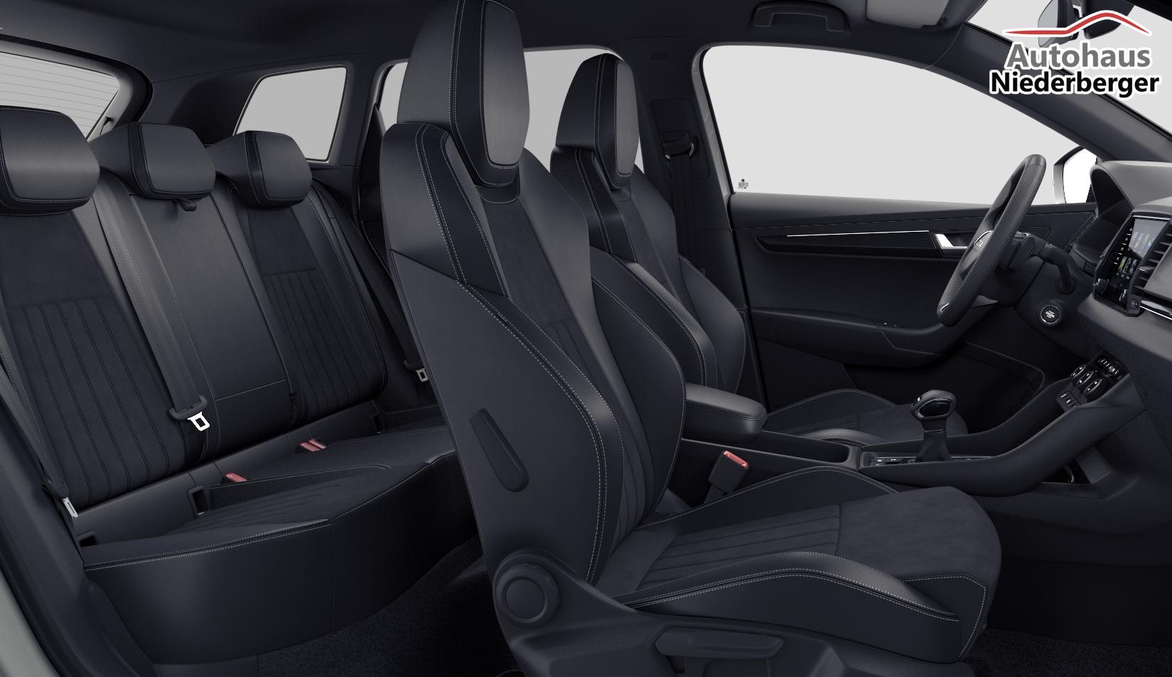 • SPORTLINE-PAKET: Design Selection Sportline LOUNGE: Komfortsitze in Leder/Suedia/Kunstleder; Pedale in Edelstahl-Ausführung; Dekor Sportline; LED-Ambientebeleuchtung Armaturenbrett (Türen, Fußraum); Einstiegsbeleuchtung vorne mit Skoda Schriftzug; Make-up-Spiegel mit LED-Beleuchtung (Fahrer- und Beifahrer-Sonnenblende); Dachhimmel schwarz; LEICHTMETALLFELGEN 19" SAGITARIUS ANTHRAZIT mit 8,0Jx19" mit 225/40 R19 Bereifung (Frontantrieb), 225/45 R19 (Allradantrieb); TRAVEL-PLUS-ASSISTENT: Spurführung adaptiv; Spurwechsel-Assistent; Auspark-Assistent; Geschwindigkeitsregelung vorausschauend; Stau-Assistent (DSG); Notfall-Assistent (DSG); USB-C-Stromanschluss in der Konsole des Innenspiegels (1 Stück); WINTER-PAKET: Sitzheizung hinten; Frontscheibe beheizbar