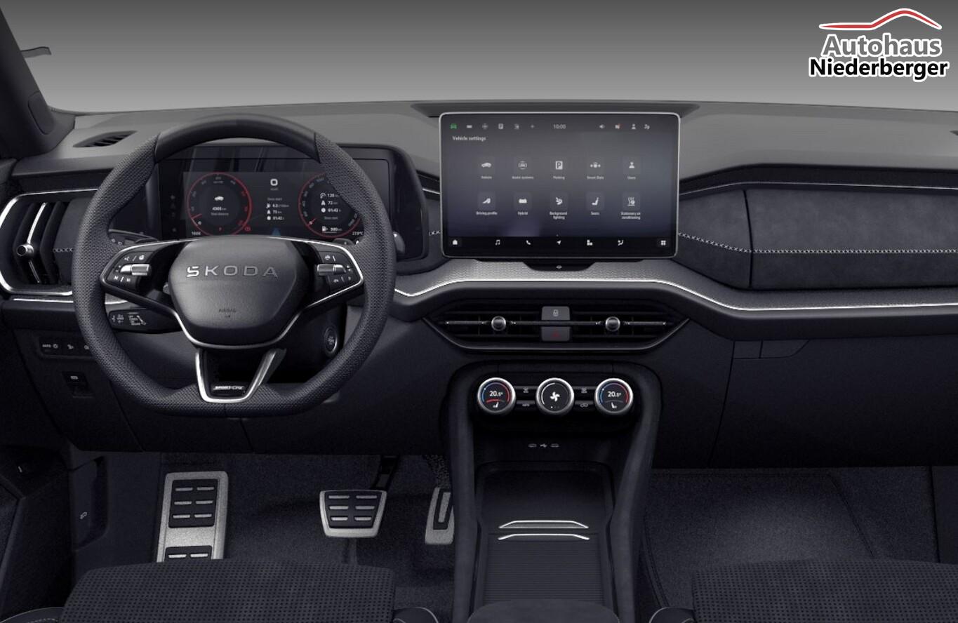 Anhängerkupplung mit Stabilitätskontrolle, Fahrassistenz-Paket (Fahrassistenz-Paket: Travel Assist / Fahrassistenz-Paket: Stau- und Notfallassistent / Fahrassistenz-System: Autom. Distanzregelung (pACC) mit vorausschauender Geschw.-Regelung / Fahrassistenz-System: aktiver Spurhalteassistent (Lenkunterstützung) / Insassen-Schutzsystem proaktiv), Ausstattungs-Paket: Family (Abfallbehälter / Ablagebox hinten / Tablet-Halterung / Sonnenschutzrollo an Seitenscheiben hinten), Winter-Paket (Sitzheizung hinten), Laderaumboden variabel und herausnehmbar, Licht- und Sicht-Paket Plus, 12V Steckdose, Ablagebox im Gepäckraum, Allwetter-, Kurven- und Autobahnlicht, Fahrassistenz-System: Dynamischer Fernlichtassistent (Dynamic Light Assist), Frontgrill mit horizontal Lichtband, Heckleuchten LED (Kristallglas-Optik), Heckleuchten LED mit dynamischem Blinklicht, Heckspoiler, Infotainment-System mit 13 Zoll Farb-Display, Innenbeleuchtung vorn und hinten, Kofferraum / Heckklappe elektrisch betätigt (öffnen + schliessen), Lendenwirbelstütze pneumatisch verstellber vorn links, Lendenwirbelstütze vorn rechts, Lichtassistent (Coming, Leaving Home), Lichtautomatik mit Abbiegelicht (AFS), LM-Felgen 7,5x19 "Tirsuli", Matrix-LED-Scheinwerfer, Navigationssystem 13 Zoll, Radioempfang Digigtal (DAB), Radschrauben diebstahlhemmend, Reifen 235/50 R19, Schadstoffarm nach Abgasnorm Euro 6e (EU6EA), Seitenscheiben hinten und Heckscheibe abgedunkelt (SunSet), Sitzbezug / Polsterung: Microfaser/ Kunstleder, Stoßfänger Sport, Tagfahrlicht, Vorbereitung für Skoda Connect, Zentralverriegelung (Fernbedienung für Zentralverriegelung), 8 Lautsprecher, Ambiente-Beleuchtung LED, Außenspiegel schwarz lackiert, Dachreling schwarz, hochglänzend, Edelstahlpedale Sportdesign, Einstiegsleisten (Edelstahl), Fahrassistenz-System: Abbiegebremsfunktion und Ausweichunterstützung, Fensterzierleisten schwarz, hochglänzend, Karosserie: 5-türig, Kombiinstrument digital (virtual cockpit plus), Kopfstützen hinten, Kopfstützen vorn, Lehnenentriegelung der Rücksitzlehne im Kofferraum, Mild-Hybrid 110 kW (Motor 1,5 Ltr. - 110 kW TSI mHEV), Mild-Hybrid-Technologie, Otto-Partikelfilter (OPF), Radstand Standard, Reifen-Reparaturkit, Sonnenblenden mit Spiegel (LED-Beleuchtung), Warnanlage für Sicherheitsgurte hinten, Warnanlage für Sicherheitsgurte, Fahrer-/Beifahrerseite, USB-Schnittstelle vorn (2-fach, Typ C), Wireless SmartLink, Anti-Blockier-System (ABS), Bremsassistent, Antriebsart: Frontantrieb, Elektron. Stabilitäts-Programm (ESP), Getriebe 7-Gang - Doppelkupplungsgetriebe DSG, Klimaanlage Climatronic 3-Zonen, Airbag Beifahrerseite abschaltbar, Airbag Fahrerseite, Isofix-Aufnahmen für Kindersitz an Beifahrersitz, Isofix-Aufnahmen für Kindersitz an Rücksitz, Kopf-Airbag-System, Rücksitzlehne geteilt/klappbar, Schließ-/Startsystem Kessy inkl. Diebstahl-Warnanlage, Seitenairbag vorn, Seitenairbag vorn mitte (Center-Airbag), Sitzheizung vorn, Sportsitze, Fahrassistenz-System: Auffahrwarnsystem mit City-Notbremsfunktion (Frontradar-Assistent), Fahrassistenz-System: Berganfahr-Assistent (Hill-Holder), Fahrassistenz-System: Verkehrszeichenerkennung, Rückfahrkamera, Lenkrad heizbar (Sport/Leder) mit Multifunktion und Schaltfunktion, Servolenkung, Einparkhilfe vorn und hinten, Fahrassistenz-System: Müdigkeitserkennung, Fahrassistenz-System: Spurhalteassistent (Lane Assist), Fahrassistenz-System: Spurwechselassistent inkl. Auspark-Assistent und Ausstiegswarnung, Reifendruck-Kontrollsystem (Aktiv), Start/Stop-Anlage