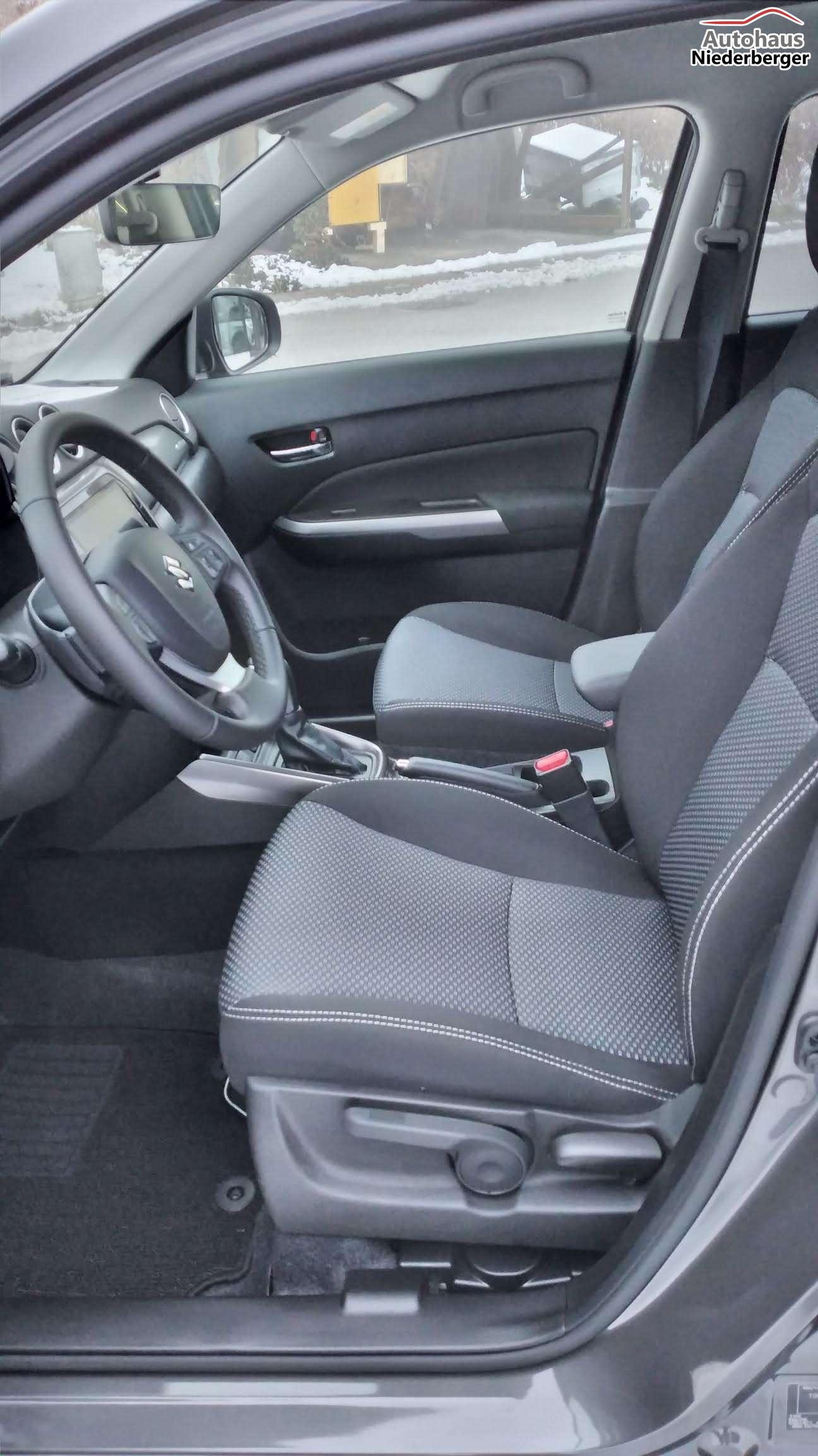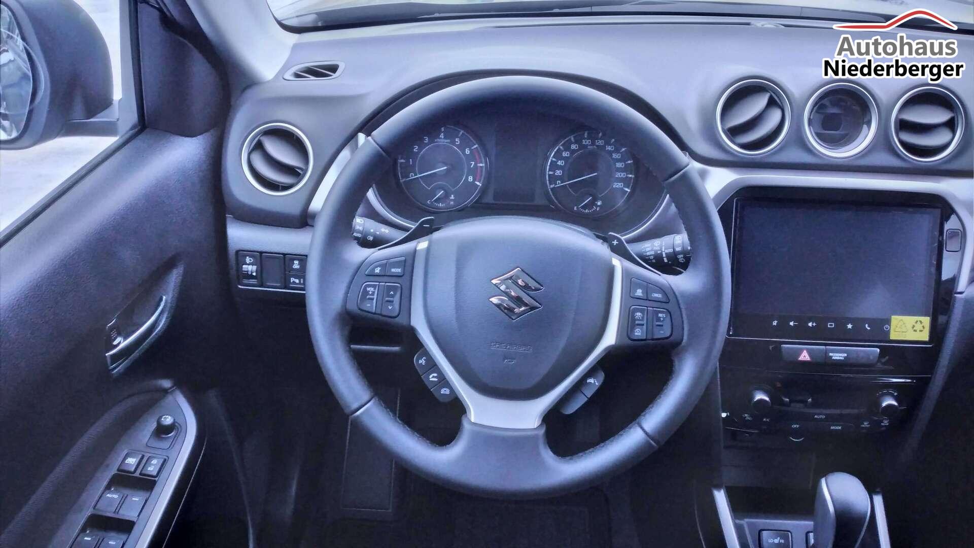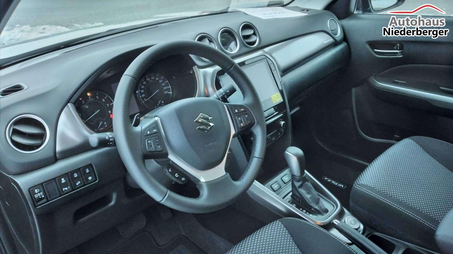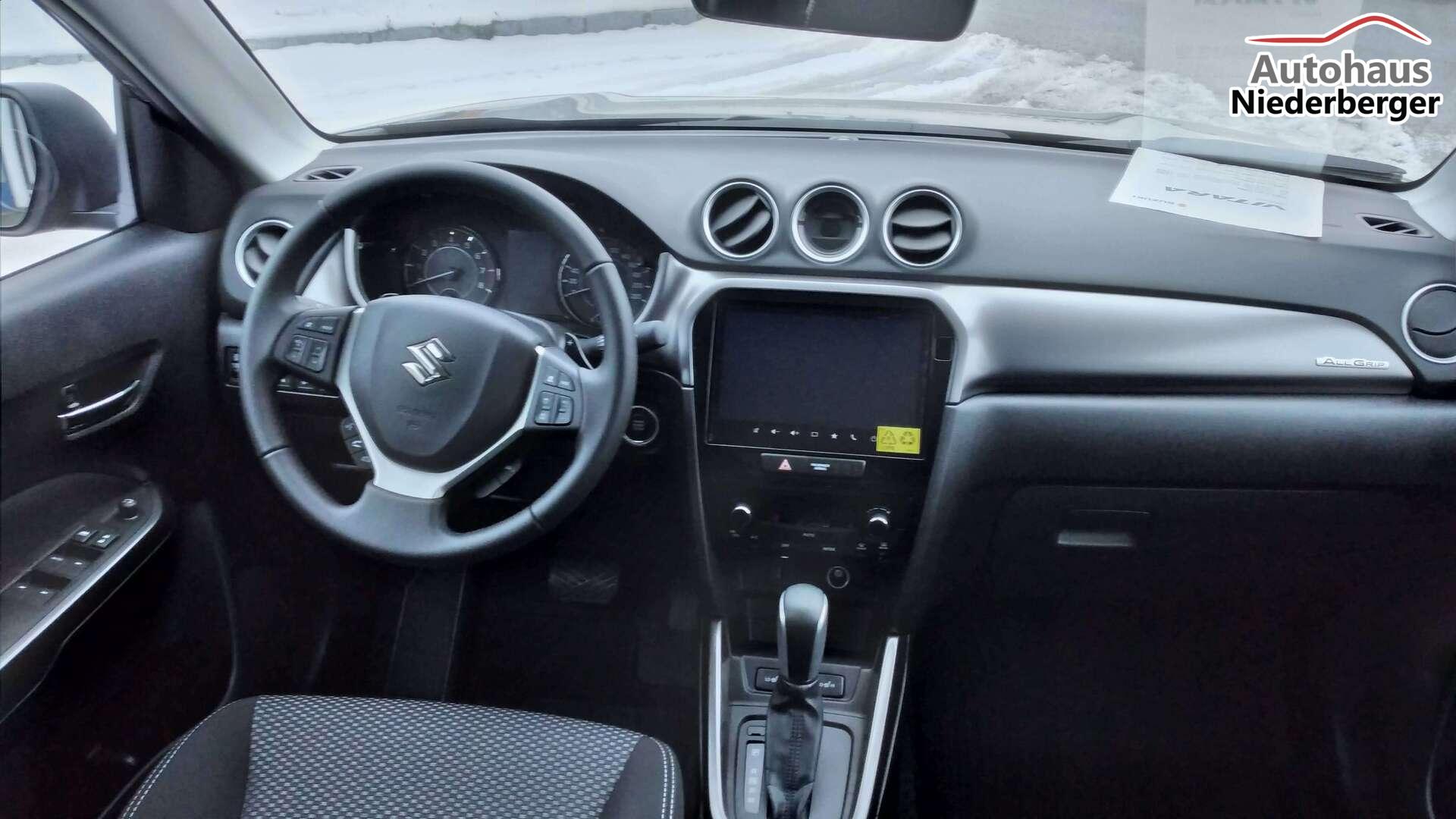Mild Hybrid System, ALLGRIP SELECT Allradsystem,17"-Alufelgen lackiert (Bereifung 215/55 R17), Adaptiver Tempomat (ACC) mit Geschwindigkeitsbegrenzer und automatischer Abschaltung4,2" Farb-LCD Multifunktionsdisplay (Digitaluhr, Außentemperatur, Schaltpunktanzeige, Durchschnittsverbrauch, Momentanverbrauch, Reichweite, TPMS), 9" Audio-System mit Smartphone-Anbindung inkl. Navigation, Bluetooth®{{{*}}}{{{*}}}{{{*}}}{{{*}}}-Freisprecheinrichtung inkl. Lenkradbedienung und DAB Radio, Fensterheber vorne und hinten elektrischLED-Scheinwerfer mit integrierter Zierleiste in silber, Keyless Start, Klimaautomatik,Rückfahrkamera, Suzuki Connect (inkl. für 3 Jahre), Sitzheizung vorne (Fahrer und Beifahrer)ABS mit elektronischer Bremskraftverteilung (EBD), Elektronisches Stabilitätsprogramm (ESP©){{{*}}}{{{*}}}{{{*}}}, Start-Stopp-System, Fahrer Monitoring-System mit Müdigkeitserkennung (DMS)Dual Sensor Brake Support mit Fußgänger-, Radfahrer- und MotorraderkennungToter-Winkel Warner und Querverkehrswarner, Spurhalteassistent, VerkehrszeichenerkennungIntelligente Geschwindigkeitsassistenz, Berganfahrhilfe, E-Call System, Einparkhilfe hinten (4 Sensoren), 12V-Anschluss im Kofferraum, 6-Gang-Automatikgetriebe inkl. Gang-Anzeige
