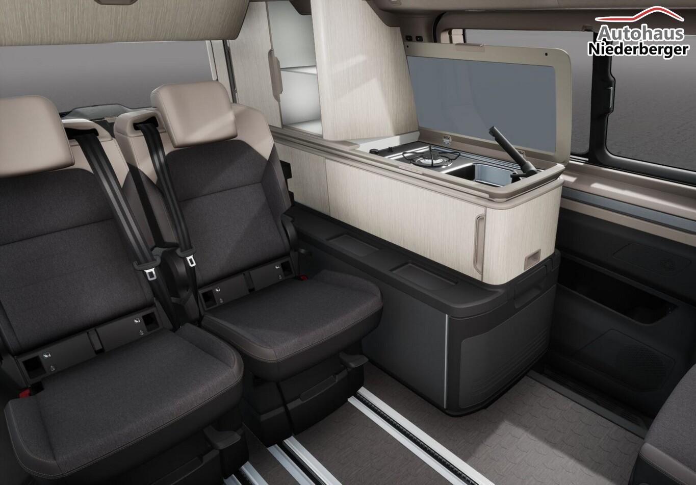 Fahrassistenz-Paket Basic (Service-System: Intelligente Fahrzeugvernetzung (Car2X) / Fahrassistenz-System: Autom. Distanzregelung (ACC inkl. Stop&Go-Funktion) / Fahrassistenz-System: Spurwechselassistent (Side Assist) mit Auspark-Assistent und Ausstiegswarnung), Markise (Gehäuse und Markisenleisten schwarz, links), Park-Paket Basic (Rückfahrkamera / Fahrassistenz-System: Parklenkassistent (Park Assist) inkl. Einparkhilfe vorn und hinten), Schließ-/Startsystem Keyless Advanced mit Safesicherung, Diebstahl-Warnanlage + Innenraumüberwachung / Abschleppschutz + Back-up-Horn, Campingtisch und Klappstühle, LM-Felgen 6,5x16 (Syrakus), Navigation in Verbindung mit dem Smartphone (über Apple Carplay / Android Auto /...), Reifen 215/65 R16, Schadstoffarm nach Abgasnorm Euro 6e (EU6 EA), Audiosystem Ready 2 Discover (Touchscreen-Farbdisplay 10", inkl. Streaming & Internet), Aufstelldach manuell betätigt mit Bugfenster und Frontöffnung, Faltenbalg grau, Außenspiegel schwarz lackiert, Bodenbelag im Lade-/Fahrgastraum Kunststoff, Digital Cockpit Pro (Instrumentenanzeige Digital), Elektrische Schnittstelle für externe Nutzung (CAN-Datenbus), Fahrassistenz-System: Ausweich-Assistent und Abbiege-Assistent, Frontscheibe Verbundglas getönt, Funkschlüssel (2), Handschuhfach beleuchtet, Heckklappe mit Verglasung und Zuziehhilfe, Innenausstattung: Dekoreinlagen Dark Silver brushed, Innenbeleuchtung an Aufstelldach, Heckklappe und Sommerküche (Coast / Ocean), Innenspiegel mit Abblendautomatik, Intelligent Speed Assist inkl. Geschwindigkeitsbegrenzer, Karosserie/Aufbau: Motor Caravan, Lautsprecher (8), Leuchtweitenregelung, Mobile Online Dienste App-Connect inkl. App-Connect Wireless (Apple CarPlay, Android Auto), Motor 2,0 Ltr. - 110 kW TDI, Nichtraucher-Paket, Radioempfang digital (DAB+), Radstand 3124 mm, Schiebetür Lade-/Fahrgastraum links mit Zuziehhilfe, Schiebetür Lade-/Fahrgastraum rechts mit Zuziehhilfe, Schubladen unter Außensitze im Fahrerraum und Fahrgastraum und 2 Abfallbehälter, Servoschliessung Heckklappe mit Innenentriegelung, Sitzausstattung: 4-Sitzer, Sitzbezug / Polsterung: Stoff Melange, Sitze im Lade-/FG-Raum: 1.Reihe, 2 Einzelsitze mit integriertem Gurt und Schlafauflage, Sommerküche mit Außenklapptisch und 230V Steckdose, Dachstaufach, in Raven / Frizo Sandwick, Sonnenblenden mit Spiegel (beleuchtet), Steckdose 230V (mit Einspeisung für Batterieaufladung), Steckdose 230V im Fahrerhaus, Verdunkelungssystem: Rollos und Thermomatten, Vorbereitung für Alkohol-Wegfahrsperre (Alcolock), Warnanlage für Sicherheitsgurte vorn und hinten, Zierleiste zwischen Scheinwerfern: schwarz lackiert und Chromleisten, Zul. Gesamtgewicht 2,85 t, Mobiltelefon Schnittstelle Bluetooth, Multimedia-Schnittstelle 2 x USB vorn und 4 x USB-Ladeanschluß Fahrgastraum (Typ C), Antriebsart: Frontantrieb, Wegfahrsperre (elektronisch), Getriebe 7-Gang - Doppelkupplungsgetriebe DSG, Klimaanlage Climatronic 3-Zonen inkl. Fondbedienung, Standheizung für Dauerbetrieb und kraftstoffbetriebene Zusatzheizung, Airbag Fahrer-/Beifahrerseite, Beifahrerairbag abschaltbar, Seitenairbag / Kopfairbag / Center-Airbag vorn und Kopfairbag hinten, Sitze im Fahrerhaus: Armlehnen beidseitig Fahrer- und Beifahrersitz und elektr. Lendenwirbelstütze, Sitze im Fahrerhaus: Beifahrersitz drehbar, Sitze im Fahrerhaus: Fahrer- und Beifahrersitz heizbar, Sitze im Fahrerhaus: Fahrersitz drehbar, Verglasung hinten abgedunkelt (65 %), Fahrassistenz-System: Verkehrszeichenerkennung, Geschwindigkeits-Regelanlage (Tempomat), Notrufsystem, Lenkrad (Leder) mit Multifunktion und Schaltfunktion, Servolenkung elektro-mechanisch, geschwindigkeitsabhängig, Heckleuchten LED, Regensensor, Scheinwerfer LED, Tagfahrlicht und Assistenzfahrlicht mit Coming Home / Leaving Home, Fahrassistenz-System: Ablenkungs- und Müdigkeitserkennung, Fahrassistenz-System: Notbrems-Assistent (Front Assist) inkl. Fußgänger- und Fahrraderkennung, Fahrassistenz-System: Spurhalteassistent (Lane Assist), Reifenkontroll-Anzeige