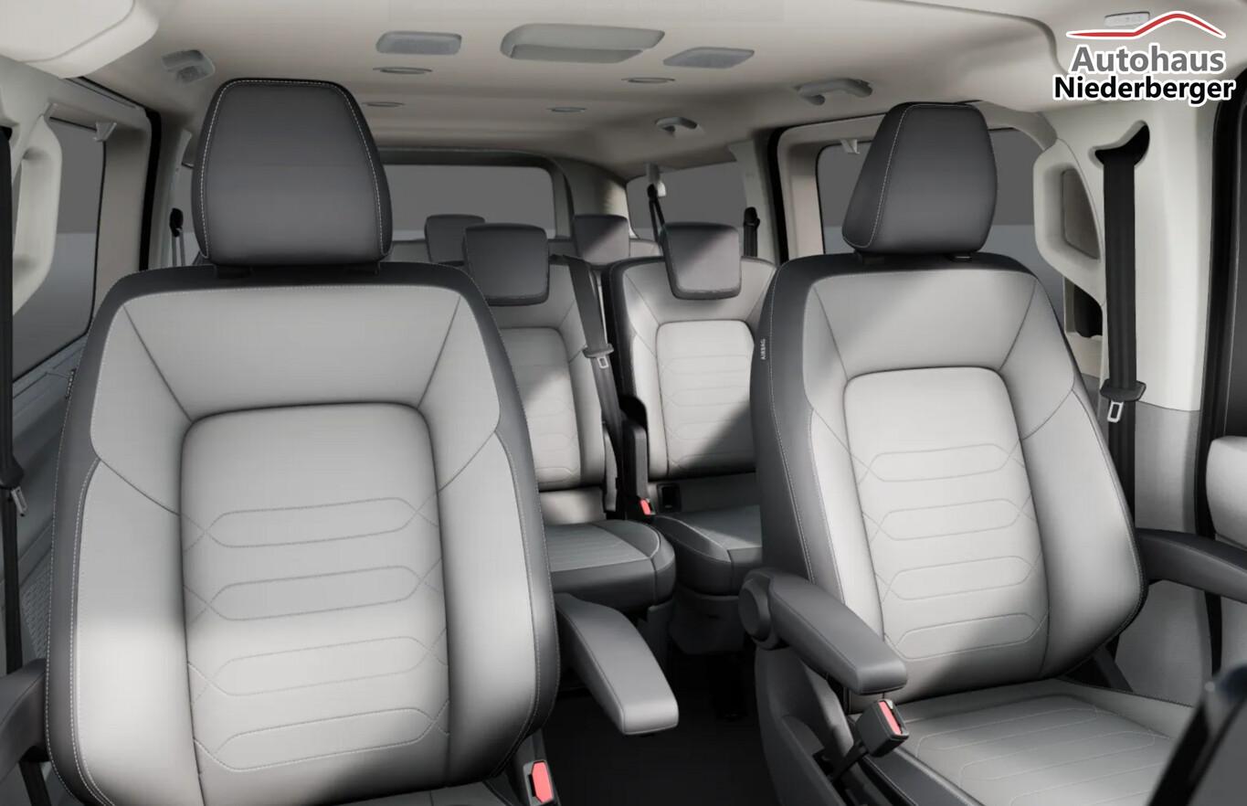 10 Lautsprecher, 12V-Steckdose an D-Säule rechts, 12V-Steckdose in der Mittelkonsole, 2 Verzurrösen, 2. Reihe mit 3 Einzelsitzen, 3. Reihe mit 3er-Sitzbank, Rückenlehne klappbar, Airbag Fahrer-/Beifahrerseite, Beifahrerairbag abschaltbar, Armlehnen vorn, Audio-Navigationssystem mit Touchscreen-Farbdisplay 13" inkl. App-Connect Wireless (Apple CarPlay / Android Auto), Außenspiegel elektr. verstell-, heiz- und anklappbar, Einparkhilfe vorn und hinten, Einstiegleisten Schiebetüren Metall, beleuchtet, Elektron. Stabilitäts-Programm (ESP), Fahrassistenz-System: Geschwindigkeits-Regelanlage mit Intelligentem Geschwindigkeits-Assistent, Fahrassistenz-System: Notbrems-Assistent, Fußgänger- und Fahrraderkennung, Ausweichunterstützung und Abbiege-Assistent, Handschuhfach beleuchtet, Kombiinstrument digital, Lenkrad (Kunstleder) mit Multifunktion, LM-Felgen 6,5x17 (Le Mans, schwarz), Notrufsystem eCall, Reifen 215/60 R17, Rückfahrkamera, Schadstoffarm nach Abgasnorm Euro 6e (EU6 EB), Schmutzfänger vorn und hinten, Seitenairbag / Kopfairbag (Curtain-Airbag) vorn und Kopfairbag (Curtain-Airbag) hinten, Sicherheitsinnenspiegel, manuell abblendbar, Sitzbezug / Polsterung: Kunstleder, Sitze vorn mit Lendenwirbelstütze, verstellbar, Sitze vorn verstellbar (6-fach), Sitzheizung vorn, Sonnenschutzrollos an den Seitenfenstern (2. Reihe), Startanlage / Zentralverriegelung Keyless Access ohne Safesicherung, Stoßfänger vorn und hinten in Wagenfarbe, USB-Schnittstellen vorn und hinten, Vorbereitung Anhängerkupplung, Wegfahrsperre (elektronisch), Heckscheibe heizbar, Karosserie/Aufbau: Bus, Motor 2,0 Ltr. - 110 kW TDI, Schiebetüren Lade-/Fahrgastraum links/rechts inkl. Zuziehhilfe, Antriebsart: Frontantrieb, Getriebe Automatik - (8-Stufen), Klimaanlage Fahrerhaus und Fahrgastraum (3-Zonen mit autom. Regelung) mit Digitales Bedienteil im Fahrgastraum, Zusatzheizung elektrisch, Verglasung hinten abgedunkelt, Fahrassistenz-System: Verkehrszeichenerkennung mit Falschfahrer-Warnfunktion, Fahrassistenz-System: Dynamische Fernlichtregulierung (Dynamic Light Assist), Heckleuchten LED mit exklusiver Lichtsignatur, Matrix-LED-Scheinwerfer (IQ.Light) inkl. Coming- und Leaving-Home, Fahrassistenz-System: Spurhalteassistent (Lane Assist)